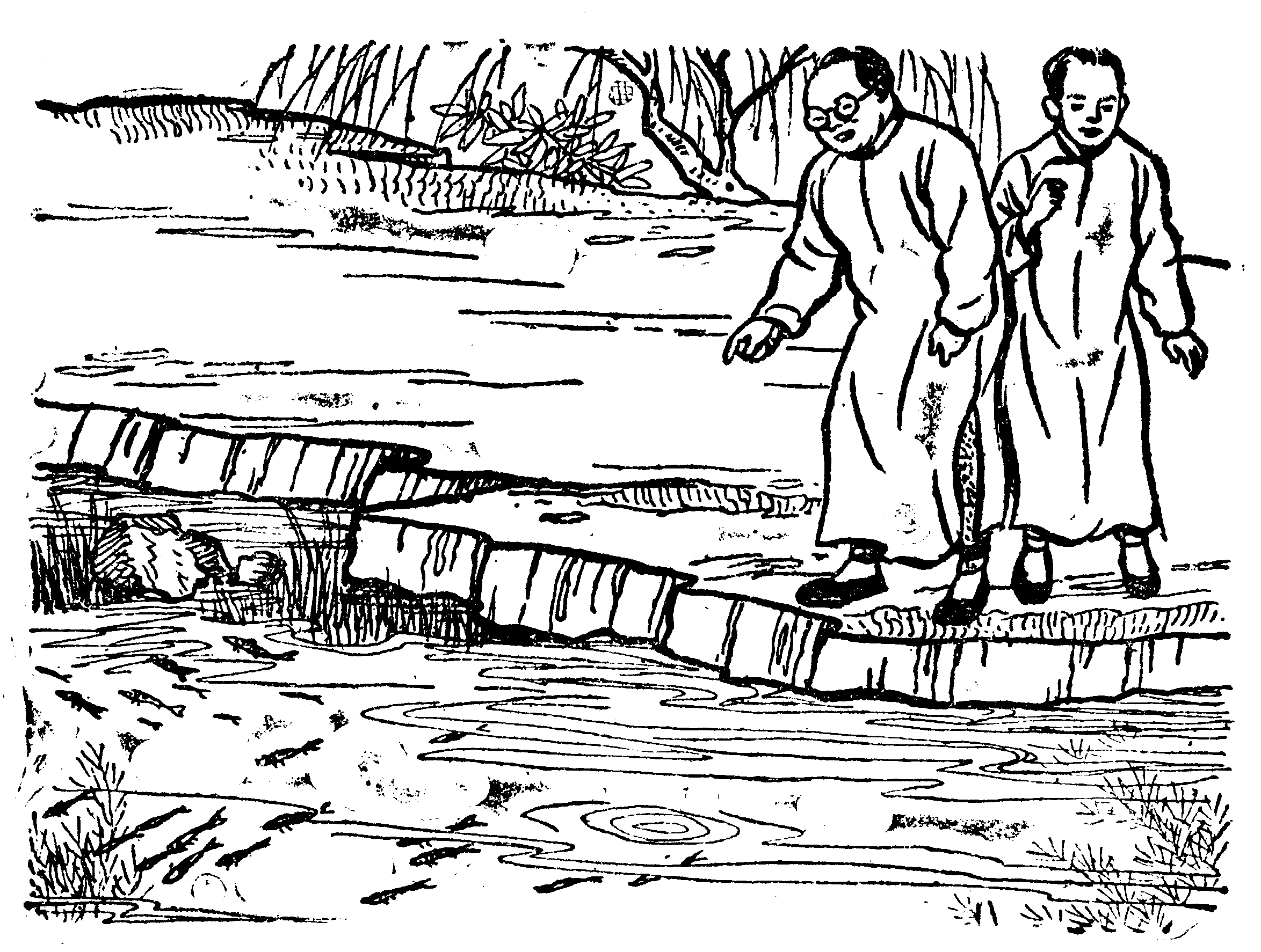 “可不是,”又是一个人说:“你看,在山上的水,清到可以当镜子用。这里却污浊得像阴沟水——这里大约有鱼吧!”
